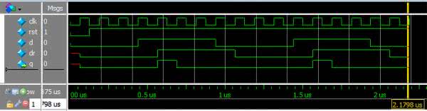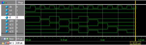 Ciekawsza jest druga część, gdzie realizujemy logikę rejestru przesuwnego. Najpierw w linii 25 znajduje się przerzutnik zerowy. Następnie pozostałe N-1 przerzutników jest wygenerowanych w pętli for. Jednak w przeciwieństwie do języków programowania tutaj nie zostanie ona wykonana iteracyjnie, ale spowoduje wygenerowanie działających równolegle bloków logik. Sprawdźmy jego działanie w symulacji: