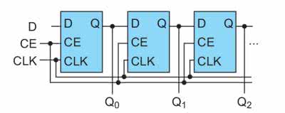 W dwóch poprzednich modułach używaliśmy przerzutnika D do opóźnienia sygnału o jeden takt zegara. Jeśli połączymy ze sobą wejścia i wyjścia kilku (w naszym module jest ich N) przerzutników otrzymamy rejestr przesuwny. Sygnał na wyjściu ostatniego z nich będzie opóźniony o N taktów zegara względem pierwszego. Schemat takiego układu pokazano na rysunku 5.