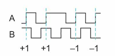 Enkoder posiada trzy złącza: A, B oraz masę. W czasie obrotu na wyjściach A i B pojawiają się przebiegi prostokątne przesunięte względem siebie w fazie o 90 stopni. Rozdzielczość pomiarowa jest określona przez liczbę impulsów przypadających na jeden obrót osi. Przykład takiego przebiegu pokazano na rysunku 10.