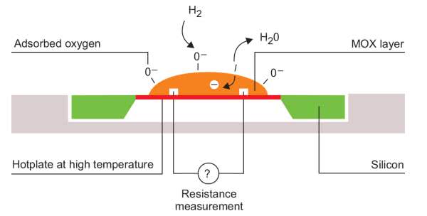 Czujniki gazu z tlenkiem metalu bazują na warstwie cząstek tlenku metalu umieszczonej między dwiema elektrodami na mikropłytce grzejnej (rysunek 1).