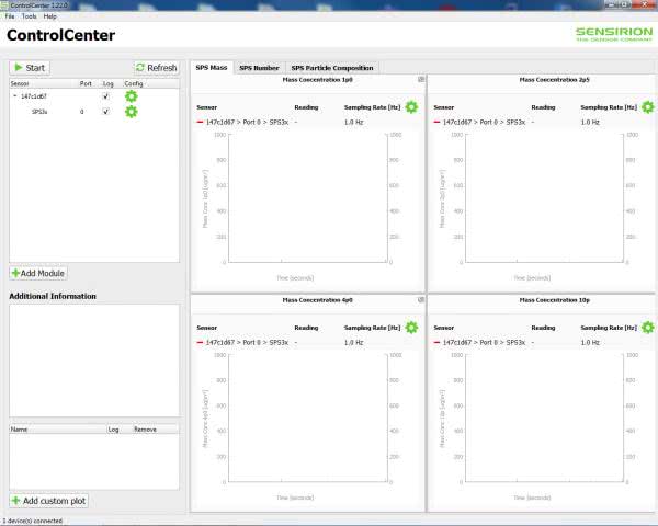 Do pracy z czujnikiem SPS30 została zastosowana aplikacja ControlCenter firmy Sensirion. Jej instalowanie i użytkowanie zostało dokładnie omówione w jednym z poprzednich artykułów pt. „Pomiary z czujnikami jakości gazu SGP30, SPGPC3 oraz dwutlenku węgla SCD30 firmy Sensirion” [S39]. Po podłączeniu czujnika SPS30 kablem konwertera USB do komputera instalowane są sterowniki USB. Po uruchomieniu aplikacji ControlCenter automatycznie znajdowany jest czujnik SPS30 i wyświetlane jest okno główne aplikacji (rysunek 10).