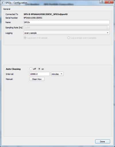Okno konfigurowania czujnika SPS30 umożliwia ustawienie liczby pomiarów do uśredniania (1 – każda, 2, 5, 10, 100, 1000) oraz zapisanie logu z przerzedzaniem lub z uśrednianiem (rysunek 11). Można też ustawić odstęp czasu, co ile wykonywana będzie procedura czyszczenia wiatraczka (Auto Cleanning).