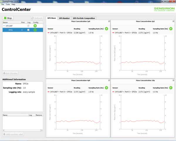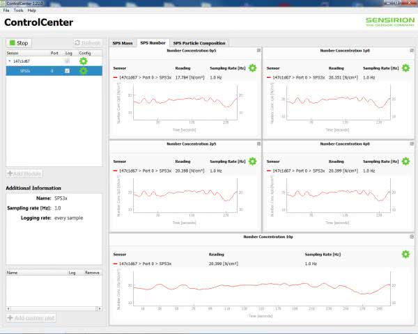 Wykresy danych z czujników są pokazywane w prawym panelu okna aplikacji (rysunek 10), zgrupowane wedle typów w osobne zakładki. Po prawej stronie każdego wykresu znajduje się ikonka w postaci koła zębatego. Wyświetla ona okno Plot Settings z możliwością ustawienia przedziału czasu pokazywanego przebiegu (domyślnie 300 s), częstotliwości aktualizacji wykresu (domyślnie 1 Hz), wyboru automatycznego skalowania oraz ustawienia formatu skali czasowej: w sekundach (czas bieżący od początku akwizycji) lub czas zegarowy. Dodatkowo można ustawić zakres skali wartości (domyślnie 10 μg/m3, N/cm3 oraz 2 mm). Po kliknięciu na pole wykresu można go przeciągać w górę i w dół, a kółkiem myszy zmieniać zakres skali wartości. Podwójne kliknięcie powoduje przywrócenie ustawień domyślnych.