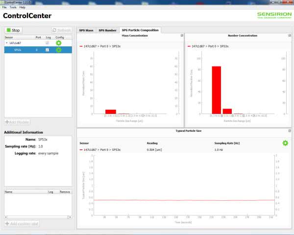 Rysunek 13 pokazuje przykładowy pomiar pierwszych 300 s po włączeniu czujnika SPS30, tych samych co na rysunku 12. Na panelu SPS Particle Composition pokazywane są dwa wykresy słupkowe rozkładu pomiarów stężenia masowego oraz liczbowego (rysunek 14).