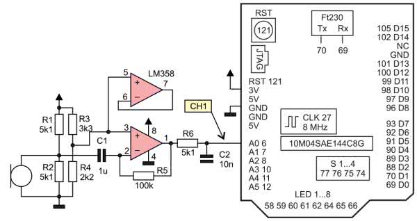 Do eksperymentów zastosujemy popularny mikrofon elektretowy. Niestety zmiany napięcia na jego wyjściu są zbyt małe, aby można je było zmierzyć za pomocą naszego przetwornika ADC. Musimy więc zbudować prosty przedwzmacniacz. Użyjemy do tego celu wzmacniacza operacyjnego LM358 i kilku elementów pasywnych. Schemat układu został pokazany na rysunku 1.