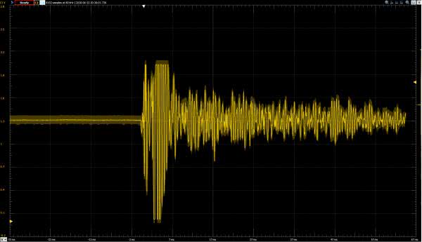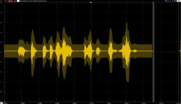 Działanie układu najłatwiej sprawdzić za pomocą oscyloskopu. Na rysunku 2 widoczna jest rejestracja mowy. Widać na nim, że sztuczna masa naszego układu odpowiada napięciu około 1,3 V.