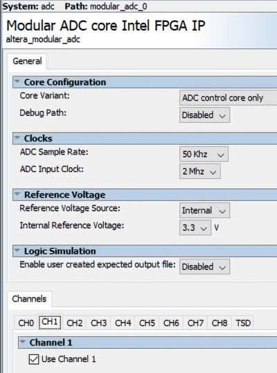 Budowę rozpoczniemy od wygenerowania bloku IP, obsługującego przetwornik analogowo-cyfrowy. Konfigurację pokazuje rysunek 5. Ustawiamy tam wybraną przez nas częstotliwość próbkowania. Zegar taktujący ADC ustawiamy na 2 MHz (będziemy musieli także odpowiednio skonfigurować pętlę PLL). Tym razem włączamy tylko kanał numer 1.