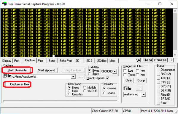 Następnie wybieramy plik docelowy i zaznaczamy opcję Capture as Hex (przechwytuj w formacie szesnastkowym). Rozpoczynamy naciśnięciem Start: Overwrite (zacznij: nadpisz), mówimy do mikrofonu i klikamy przycisk Stop Capture (zatrzymaj przechwytywanie).