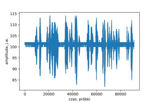 Uzyskany wykres pokazuje rysunek 8. Sygnał oscyluje wokół liczby 100. Jego wartości mieszczą się w przedziale 80…115. Oznacza to, że większość z dostępnego nam zakresu (0…255) jest niewykorzystana. Używamy jedynie przedziału o szerokości poniżej 35. Odpowiada on nieco ponad pięciu bitom danych, przy czym przesyłamy ich aż osiem. W dalszej części spróbujemy poprawić ten wynik.