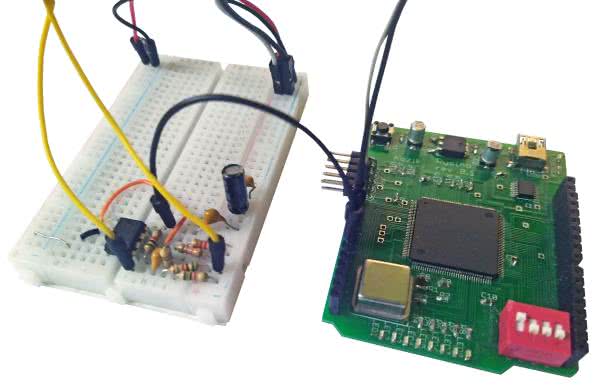 Sygnał podłączamy do analogowego wejścia A0 płytki Rysino. Musimy jeszcze zatroszczyć się o niewykorzystaną połowę LM358. Wyjście drugiego wzmacniacza zostało połączone z jego wejściem odwracającym, natomiast wejście nieodwracające zwarto do masy. Realizacja na płytce stykowej jest pokazana na fotografii 1.