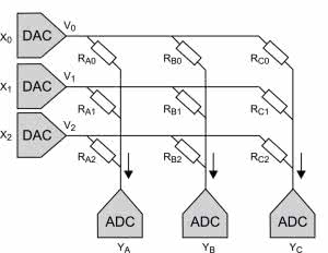 Firma Mythic używa 256-rzędowych wartości analogowych rezystancji, do reprezentowania 8-bitowych liczb całkowitych, które z kolei reprezentują wagi węzłów, a następnie implementuje mnożenie przez prawo Ohma (rysunek 2). Wartości wejściowe są wyrażane jako napięcia, wagi jako przewodnictwo (odwrotność rezystancji), a wyjście jest reprezentowane jako prąd (I=V×G). Dokładność wynosi 4 bity. Zarówno układy PIM, firmy Mythic, jak i Syntiant, koncentrują się na wnioskowaniu. Liczba wag jest punktem odniesienia pomiaru wnioskowania symulacji PIM. Większa liczba wag, zwykle oznacza również większą i szybszą moc obliczeniową pracy.