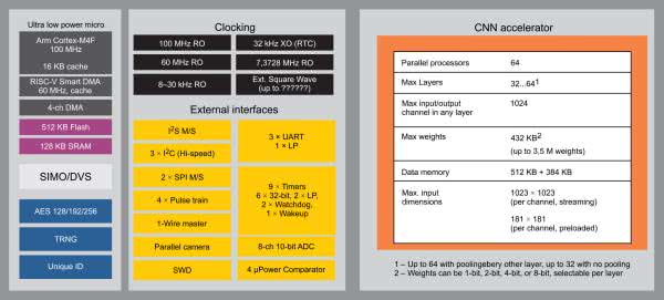 - akcelerator sieci neuronowej CNN: 64 rdzenie 50 MHz, 512 kB SRAM, do 64 warstw, obliczanie splotu 1 i 2 wymiarowego, obsługa innych typów sieci (MP, Recurent NN),
