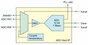 Uproszczony schemat przetwornika pokazuje rysunek 2. Ma on formę tak zwanego hard IP block, czyli „twardego” bloku własności intelektualnej, który jest na stałe „wytrawiony” w strukturze układu. Pierwszym jego elementem jest analogowy multiplekser, gdzie wybieramy wejście analogowe, na którym ma być wykonany pomiar. Dalej znajdziemy moduł S&H (sample and hold), czyli układ próbkująco-podtrzymujący. Dzięki niemu mierzone napięcie jest stałe przez cały czas pomiaru. Kolejnym elementem jest przetwornik analogowo-cyfrowy typu SAR (successive approximation ADC, czyli przetwornik z sukcesywną aproksymacją).