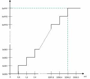 Napięciu 0 V odpowiada wartość 0x000, a maksymalnemu napięciu, wartość 0xFFF (4095). Rysunek 3 pokazuje wartości zwracane względem różnych napięć wejściowych, dla wartości napięcia odniesienia równego 3,3 V. Zwróćmy uwagę, że 0xFFF nie oznacza wartości maksymalnej, ale jest zwracana dla wartości mniejszej o jeden krok (dla 3,3 V jest to napięcie 3,292 V). Maksymalna częstotliwość próbkowania to milion próbek na sekundę (z wyjątkiem termometru, dla którego jest ograniczona do 50 tysięcy).