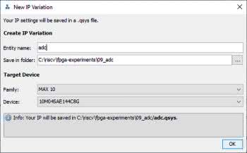 W polu Entity name (nazwa instancji) wpisujemy nazwę wygenerowanego modułu (wpisałem adc). W kolejnym polu Save in folder (zapisz w folderze) podajemy miejsce w którym będą zapisane pliki. Można zostawić opcję domyślną, czyli główny folder projektu. Aby utrzymać większy porządek w plikach, można utworzyć nowy folder, dopisując go w ścieżce (utworzyłem tu folder adc). W dolnej części okna widzimy rodzinę układów scalonych (tutaj MAX10) oraz dokładny model układu. Podane informacje zostały pobrane z konfiguracji projektu. Zatwierdzamy naciskając OK.
