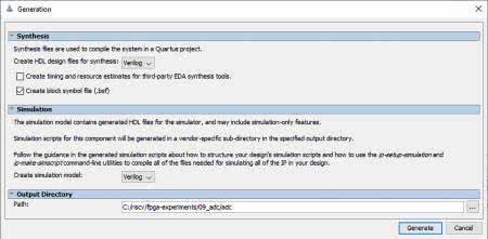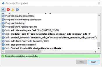 Przechodzimy do okna wyboru parametrów i generowania kodu RTL. Okno dzieli się na dwie części: konfigurację kodu HDL (wykorzystywanego do syntezy) oraz implementację. W obydwu częściach wybieramy język Verilog. Na samym dole mamy możliwość wybrania ścieżki (Path). Pliki będą umieszczone w dodatkowym folderze, o takiej nazwie jak nazwa IP. Klikamy Generate (generuj). Pojawi się okienko (rysunek 9), w którym zostaniemy poinformowani o wykonywanych czynnościach, a gdy się zakończą, klikamy przycisk Close. Ostatnim krokiem jest dodanie do projektu pliku adc.qip, z katalogu synthesis.