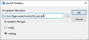 Pojawi się okno (rysunek 11), w którym możemy wybrać lokalizację plików dla nowego komponentu oraz język. Tworzymy nowy folder pll i wybieramy Verilog. Po kliknięciu OK przejdziemy do kreatora, w którym wybierzemy konfigurację.
