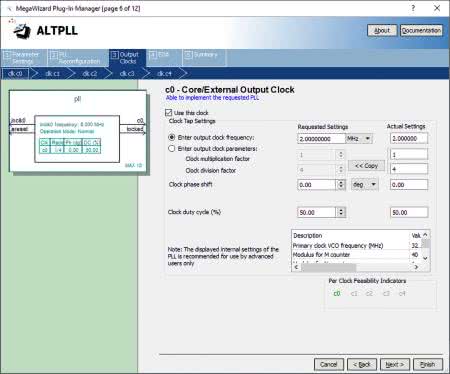 Klikamy kilkukrotnie Next, aż dojdziemy do sekcji Output Clocks (zegary wyjściowe). Pierwszy ekran (rysunek 14) odpowiada za wyjście clk c0. Zaznaczamy opcję Enter output clock frequency (podaj częstotliwość wyjściowego sygnału zegarowego). W polu tekstowym, zgodnie z ustawieniami podczas konfiguracji ADC, wpisujemy 2 MHz. Ustawienia przesunięcia fazy (clock phase shift) i wypełnienia (clock duty cycle) zostawiamy bez zmian. To już ostatni ekran, w którym dokonujemy zmian. Warto zapoznać się z kolejnymi wyjściami za pomocą przycisku Next ale niecierpliwi mogą od razu skorzystać z opcji Finish.