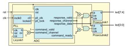 Na rysunku 2 widoczne są dwie magistrale, pozwalające na obsługę przetwornika. Pierwsza z nich, wejściowa, pozwala na wybór kanału. Kiedy zakończy się konwersja, na magistrali wyjściowej pojawi się numer zmierzonego kanału oraz uzyskana wartość. Ostatnim elementem jest zegar, który taktuje przetwornik. Na stałe jest to zerowe wyjście z bloku PLL, na cztery dostępne (phase lock loop, czyli pętli synchronizacji fazy). Dzięki temu można zmieniać częstotliwość próbkowania w szerokim zakresie. Dokładny opis bloku znajduje się w dokumentacji technicznej [3] zegara.