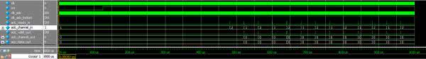 Magistrala wyjściowa składa się z trzech sygnałów: informacji o poprawności danych (valid), numeru kanału (channel) oraz samych danych (data). Tym razem nie mamy wejścia ready. Oznacza to, że nie można zablokować pracy przetwornika, a nieprzetworzone próbki zostaną utracone.