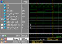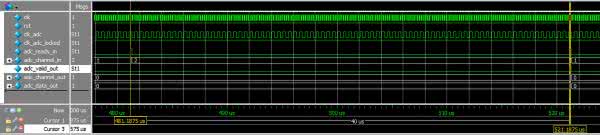 Rezultat symulacji pokazany jest na rysunku 17. W pierwszym i trzecim wierszu znajdziemy sygnały zegarowe: wejściowy clk oraz wygenerowany przez PLL clk_adc. Na rysunku 18 widzimy sygnał w powiększeniu. Możemy zobaczyć, że konfiguracja jest poprawna: wyjściowy sygnał ma częstotliwość cztery razy mniejszą niż wejściowy, czyli w naszym przypadku 2 MHz.