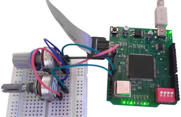 Mając zbudowany projekt, możemy przystąpić do testowania działania na sprzęcie. W tym celu, zgodnie ze schematem z rysunku 22, do wejść A0 i A1 podłączamy potencjometry. Przykładową realizację na płytce stykowej możemy zobaczyć na fotografii 1. Po zaprogramowaniu układu FPGA, będziemy mogli zmieniać stan diod poprzez obrót gałek. Wynik końcowy został zaprezentowany na filmie [4].