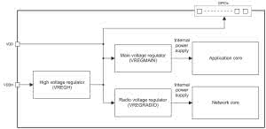 - Tryb z normalnym napięciem zasilania – regulator wysokiego napięcia jest wyłączony. Wejściowe napięcie zewnętrzne jest dołączone do wyprowadzenia VDD a następnie do regulatora głównego, do regulatora radiowego oraz do układów sterowania wyprowadzeń (GPIO),