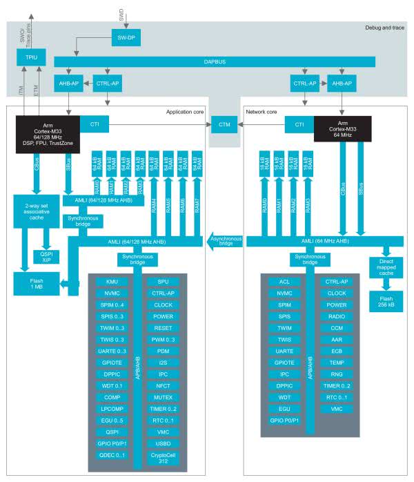 Schemat blokowy procesora nRF5340 jest pokazany na rysunku 2. Rdzeń aplikacyjny ARM Cortex-M33 zapewnia energooszczędną arytmetykę (DSP), obliczenia zmiennoprzecinkowe (FPU), kontroler przerwań (NVIC) oraz moduł ochrony pamięci (MPU). Może pracować z obniżoną częstotliwością zegara ze 128 MHz do 64 MHz co pozwala na zmniejszenie mocy zasilania. Ma dołączoną pamięć Flash (1 MB) oraz RAM (512 kB).