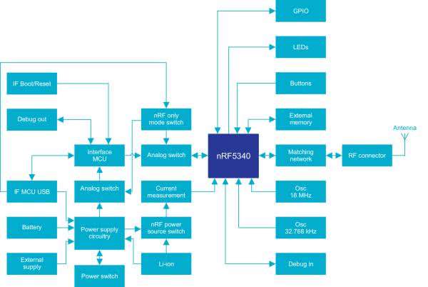 Schemat blokowy zestawu uruchomieniowego nRF5340 PDK został pokazany na rysunku 5. Najważniejszym elementem płytki jest układ scalony procesora nRF5340, zalutowany po prawej stronie płytki drukowanej. Do układu scalonego dołączony jest kwarc 32,768 kHz oraz kwarc 32 MHz.