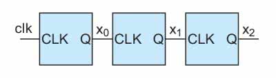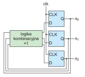 Wróćmy do naszego licznika, rysunek 4 przedstawia jego synchroniczną wersję. Tak jak poprzednio składa się on z trzech przerzutników D. Tym razem jednak są one taktowane wspólnym sygnałem zegarowym. Ich wyjścia wchodzą następnie na logikę kombinacyjną, która realizuje dodawanie jedynki. Tutaj już określenie maksymalnej częstotliwości zegara jest łatwiejsze. Jego okres musi być większy niż łączny czas ustawienia się nowego stanu na wyjściu przerzutnika, propagacji przez logikę i jego ponownego zapisu. W uproszeniu układ z rysunku 4 można przedstawić „wektorowo” jak pokazuje to rysunek 5. Pogrubiona linia obrazuje przepływ nie jednego, ale (w tym przypadku) trzech sygnałów.