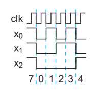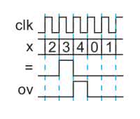 Przebieg „=” oznaczający wyjście z bloku porównania ma stan wysoki podczas gdy x=3. Jednak zostaje on przepisany na wyjście ov dopiero na następnym takcie zegara, kiedy x osiągnie już wartość 4. Synchroniczny reset przerzutników D nastąpi dopiero na kolejnym zboczu zegara, co spowoduje, że kolejną wartością x będzie 0.