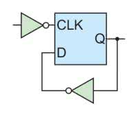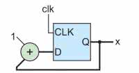 Nasz układ FPGA wyposażony jest w przerzutniki typu D reagujące na dodatnie zbocze. Jednak dałoby się z nich skonstruować przerzutniki reagujące na zbocze ujemne dodając dodatkową logikę jak pokazuje to rysunek 3. Takie rozwiązanie jednak nie jest zalecane. Powstały w ten sposób licznik jest asynchroniczny (ripple counter). Problemem jest tu szybkość propagacji sygnałów poprzez połączenia i tablice LUT oraz czasy reakcji przerzutników [1]. Zaleca się, aby logika zaimplementowana w układzie FPGA była synchronizowana wspólnym zegarem – czyli znajdowała się w jednej domenie zegarowej. W uproszczeniu można to rozumieć jako połączenie razem wszystkich wejść zegarowych przerzutników D.