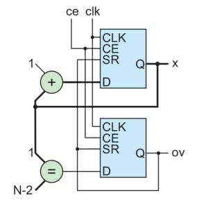Początkowo mało intuicyjny jest fakt, że mimo iż liczymy do N-1, sygnał resetu generujemy już gdy wartość licznika jest równa N-2. Spowodowane jest to tym, że chcemy aby sygnał resetu nie był podawany bezpośrednio z logiki kombinacyjnej, ale został najpierw zapisany w rejestrze. Z tego powodu musimy ją wykrywać jeden takt zegara wcześniej. Dzięki temu, że licznik liczy po kolei możemy to zrealizować po prostu poprzez zmniejszenie liczby przy której zgłaszamy sygnał. Aby lepiej wyobrazić sobie jego działanie na rysunku 7 przedstawiony jest przypadek dla N=5.