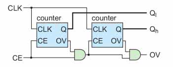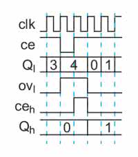Pierwszy licznik (Ql) liczy modulo 5. W momencie doliczenia do 4 na jego wyjściu OV pojawia się stan wysoki. Tutaj widzimy dlaczego wejście CEh drugiego licznika musi być iloczynem logicznym wyjścia OVl i CEl. Gdyby tego nie uwzględnić górny licznik został by zinkrementowany dwukrotnie.