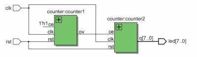 Tworzenie nowego projektu prześledziliśmy w poprzedniej części. Dlatego tym razem moduł został już dodany do projektu, który znajdziemy w pliku regs\counter\clk_counter.qpf. Możemy go otworzyć w środowisku Quartus. Także wyjścia modułów zostały już podłączone do pinów układu FPGA. Zsyntezujmy go uruchamiając polecenie Compile Design i przyglądnijmy się uzyskanym wynikom. Zacznijmy od znanego już nam narzędzia RTL Viewer. Dzięki temu, że podzieliliśmy projekt na moduły najpierw zobaczymy tylko połączenia pomiędzy nimi, co zostało pokazane na rysunku 11.