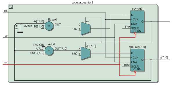Widzimy, że tym razem wykorzystany jest sygnał synchronicznego resetu opisany jako SCLR (synchronius clear). Warto także zwrócić uwagę, że przy implementacji dodawania użyto ścieżki przeniesienia łączącej wyjścia COUT z wyjściami CIN sąsiednich bloków LUT. Realizacja porównania zajmuje 3 osobne bloki LUT oznaczone jako ov~0, ov~1 i ov~2 oraz jeden rejestr ov.