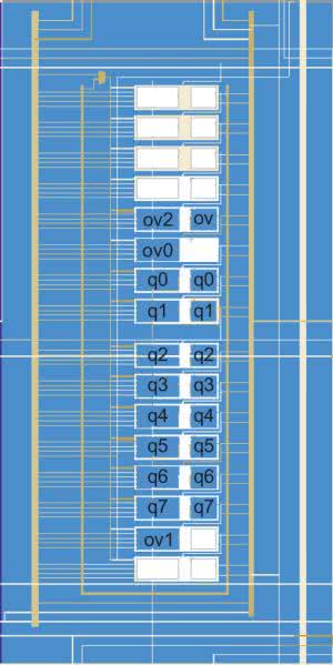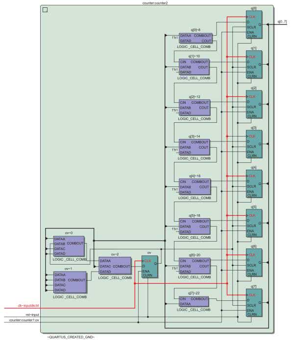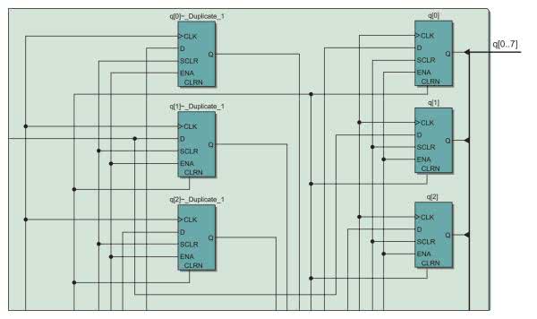 Okazuje się, że przerzutniki, do których zapisane jest wyjście zostały zdublowane. Gdy przyjrzymy się rysunkowi dokładniej zauważymy, że rejestry oznaczone jako duplicate są użyte jako wejścia dla logiki kombinacyjnej realizującej zliczanie. Natomiast wyjścia pozostałych są wyprowadzone na zewnątrz.