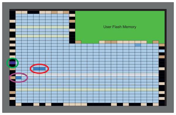 Na rysunku 16 widzimy rozlokowanie poszczególnych elementów logiki w układzie FPGA. Zduplikowany rejestr został zaznaczony zielonym okręgiem. Został on zlokalizowany na samej krawędzi układu. Gdy powiększymy to miejsce zobaczymy, że został użyty rejestr znajdujący się w strukturze odpowiadaj za sterowanie wyjściami.