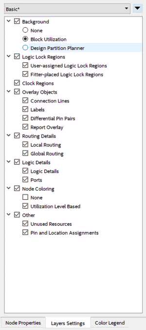 Miejsce oznaczone czerwonym okręgiem to lokalizacja licznika 1, a fioletowym to licznika 2. Na rysunku 17 widzimy powiększenie LAB w którym zaimplementowany został ten drugi. Dodatkowo na rysunku podpisano którym częściom projektu odpowiadają poszczególne struktury. Tutaj warto wspomnieć, że LAB jest skrótem od Logic Array Block i składa się z 16 sąsiadujących elementów logicznych LE, połączeń pomiędzy nimi oraz sygnałów kontrolnych. Jeżeli nawet po powiększeniu nie widzimy wszystkich elementów pokazanych na rysunku 17 możemy zmienić ich widoczność korzystając z panelu Layers Settings pokazanego na rysunku 18.