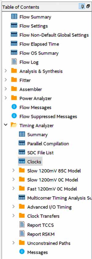 Aby zapoznać się z wynikami odnośnie czasów z panelu po lewej stronie programu Quartus wybieramy opcję Timing Analyzer – Clocks (rysunek 19).