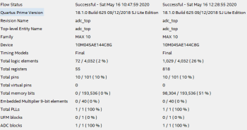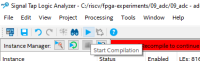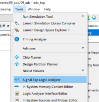 Do eksperymentów wykorzystamy projekt odczytu dwóch kanałów ADC, który stworzyliśmy w poprzedniej części kursu (można go pobrać z repozytorium [1]). Otwieramy środowisko Quartus i załadowujemy projekt 09_adc\09_adc.qpf. Następnie wywołujemy jego budowę i czekamy, aż się zakończy. Warto zanotować poziom wykorzystania komponentów układu FPGA, aby po dodaniu modułu Signal Tap, porównać jak się zmienił.