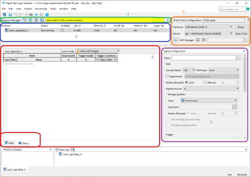 W sekcji (2) znajdziemy listę dostępnych instancji, czyli wersji naszego analizatora logicznego. Możemy przygotować kilka wariantów i aktywować ten, który akurat potrzebujemy. Na potrzeby projektu aktywujemy tylko jeden. Sekcja (3) to główne okno projektu składające się z dwóch kart, między którymi możemy się przełączać za pomocą przycisków, zlokalizowanych w lewym dolnym rogu. Na początku znajdujemy się w zakładce Setup (ustawienia). Na razie jest ona pusta, ale niebawem dodamy tu sygnały, które chcemy obserwować. W drugiej zakładce Data (dane) dostępne będą zebrane dane. Mniejszy panel (4) pozwala na obsługę interfejsu JTAG. Możemy tu wybrać programator, wykryć wersję układu FPGA oraz wgrać bitfile, dzięki czemu nie musimy przełączać się do okna programatora. Na końcu została nam zakładka (5) – Signal Configuration (konfiguracja sygnału), gdzie ustawiamy opcje takie jak zegar, który będzie taktował nasz moduł, oraz liczbę próbek jaką chcemy zapisać. Przyjrzyjmy się teraz krok po kroku co musimy skonfigurować, aby zebrać interesujące nas dane.