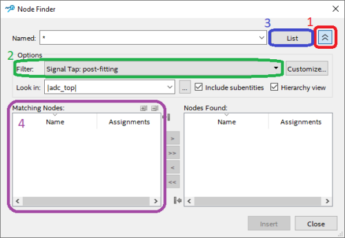 Zacznijmy od dodania sygnałów, które chcemy obserwować. Klikamy na środku okna (3), obok napisu Double-click to add nodes (kliknij dwukrotnie aby dodać węzły). Otworzy się okno Node Finder, pokazane na rysunku 3. Najpierw naciskamy przycisk (1). Pojawią się dodatkowe opcje. Aby zobaczyć wszystkie dostępne sygnały z Filter (2) wybieramy Design Entry (all names). Następnie naciskamy List (3). Dostępne sygnały pojawiają się w oknie Matching Nodes (4).