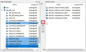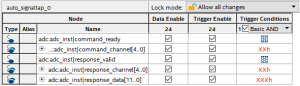 Na rysunku 4 pokazano okno z już załadowaną listą połączeń. Teraz możemy wybrać sygnały, które nas interesują. Wybieramy wejściowy sygnał command_channel, który służy do wybrania kanału do przetworzenia, oraz command_ready, mówiący o gotowości przetwornika do kolejnego pomiaru. Decydujemy się także na trzy sygnały z interfejsu wyjściowego: response_channel, response_data oraz response_valid.