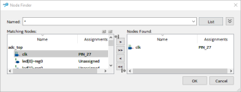 Znowu pojawi się okno Node Finder, pokazane na rysunku 7. Tutaj także naciskamy przycisk List, a następnie dodajemy linię clk z komponentu adc_top. Jest to nasze wejście zegarowe, gdzie dołączony jest zewnętrzny generator sygnału. Zatwierdzamy przyciskiem OK.