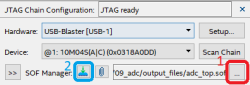 Klikamy przycisk (1) i ładujemy plik ze zbudowanym projektem output_files\adc_top.sof. Następnie programujemy układ FPGA, klikając (2).