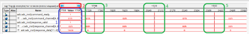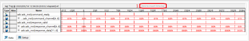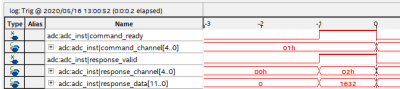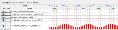 Uruchomiliśmy narzędzie w trybie wyzwalanym przez nas. Ponieważ wybraliśmy bardzo duży rozmiar bufora, a interesujące nas zdarzenia (odczyt z ADC) występują często i w stałych odstępach czasu, to i tak złapaliśmy dość dużą ich liczbę. Jednak w przypadku zdarzeń występujących rzadziej, możemy posłużyć się wyzwalaniem (ang. trigger). Wróćmy do zakładki setup i w kolumnie trigger conditions (warunki wyzwalania) kliknijmy prawym przyciskiem myszy w wierszu response_valid.