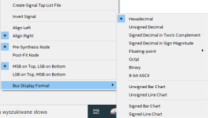 Aby zmienić sposób interpretowania danych, klikamy prawym przyciskiem myszy na nazwę sygnału. Z menu kontekstowego wybieramy ostatnią pozycję – Bus Display Format (format wyświetlania szyny), co pokazuje rysunek 13. Przykładowo, dla sygnału response_data wybiorę opcję Unsigned Decimal, czyli wartości dziesiętne bez znaku.