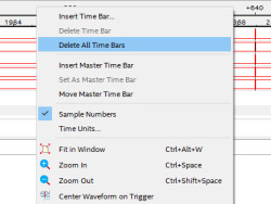 Kiedy naciśniemy po raz kolejny na górny pasek, dodany zostanie następny kursor, którego wartość podana będzie względem pierwszego (głównego) kursora. Na rysunku 14 dodane zostały dwa takie kursory – (4) i (5), umiejscowione w momentach, gdy pojawia się kolejna dana na wyjściu. Widzimy, że pomiędzy dwoma kolejnymi odczytami mija 320 cykli zegara, a ponownie obsłużenie kanału pierwszego następuje po 620 cyklach. Ponieważ częstotliwość zegara to 8 MHz, odpowiada to kolejno 40 ms i 80 ms. Widzimy więc, że ADC dokonuje pomiaru z częstotliwością 25 kHz, czyli zgodnie z tym, co ustawiliśmy w konfiguracji. Aby usunąć wskaźniki, klikamy na pasek prawym przyciskiem myszy, a z menu kontekstowego wybieramy Delete All Time Bars (usuń wszystkie kursory czasu), jak na rysunku 15.