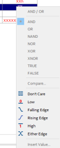 Pojawi się zaprezentowane na rysunku 16 menu kontekstowe, gdzie możemy wybrać kiedy ma nastąpić wyzwolenie pomiaru. Domyślna opcja to Don’t Care (nie przejmuj się). Możemy też wybrać reakcję na wartość, albo na zbocze. Ja wybiorę wyzwalanie na zbocze narastające (Rising Edge). Można także określić, jak będą traktowane kryteria dla poszczególnych sygnałów. Listę dostępnych opcji pokazuje rysunek 17.